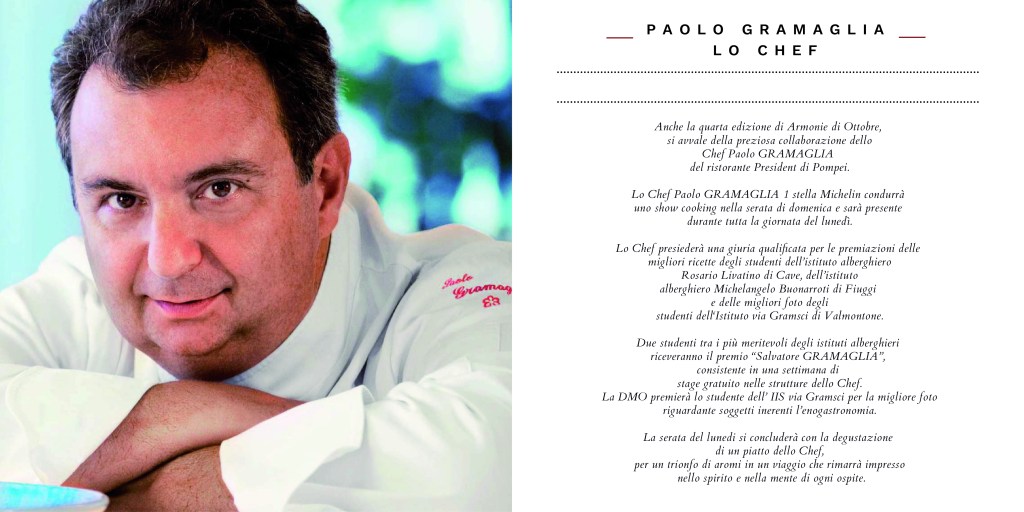 Ore 20:30 Lo Chef Paolo Gramaglia 1 Stella Michelin patron del President di Pompei proporrà uno dei suoi piatti per 100 appassionati. Le prenotazioni possono essere effettuate tramite personale dello Staff in loco e in prevendita tramite la Proloco di Valmontone info@prolocovalmontone.it § +39 333 412 0100 § 06 959 1040